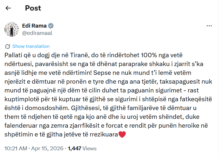 “Pallati që u dogj dje në Tiranë, do të rindërtohet 100% nga vetë ndërtuesi, pavarësisht se nga të dhënat paraprake shkaku i zjarrit s’ka asnjë lidhje me vetë ndërtimin! Sepse ne nuk mund t’i lemë vetëm njerëzit e dëmtuar në pronën e tyre dhe nga ana tjetër, taksapaguesit nuk mund të paguajnë një dëm të cilin duhet ta paguanin sigurimet – rast kuptimplotë për të kuptuar të gjithë se sigurimi i shtëpisë nga fatkeqësitë është i domosdoshëm. Gjithësesi, të gjithë familjarëve të dëmtuar u them të ndjehen të qetë nga kjo anë dhe iu uroj vetëm shëndet, duke falenderuar nga zemra zjarrfikësit e forcat e rendit për punën heroike në shpëtimin e të gjitha jetëve të rrezikuara,” shkruan Rama.
