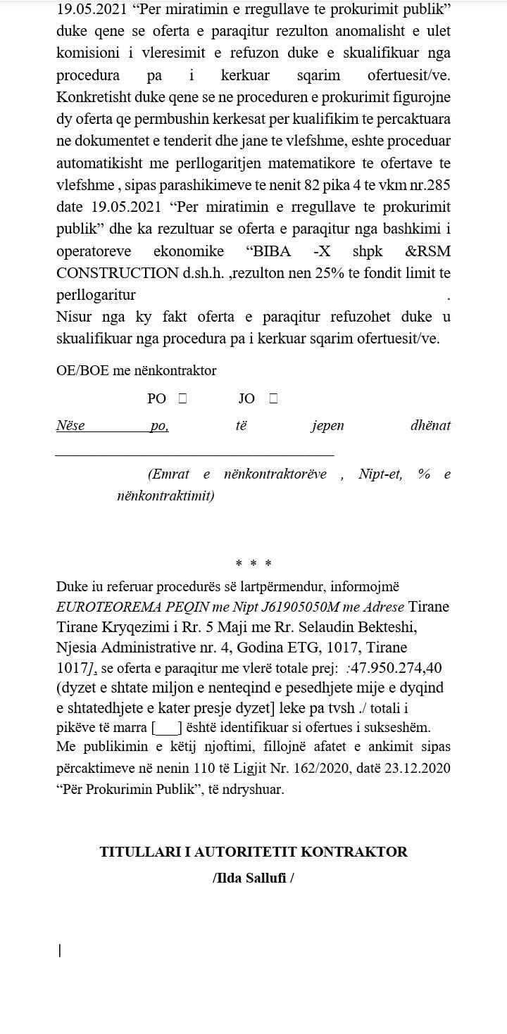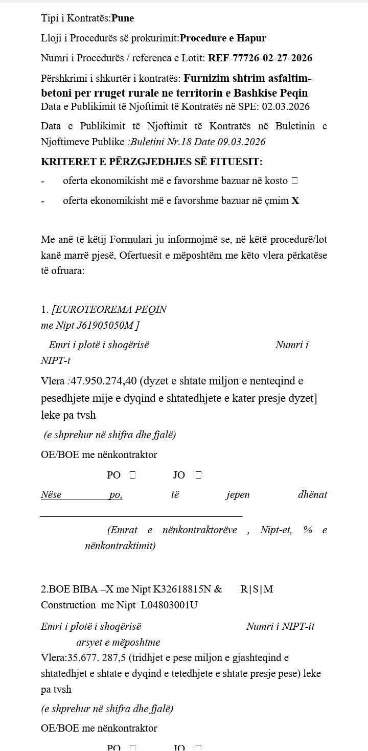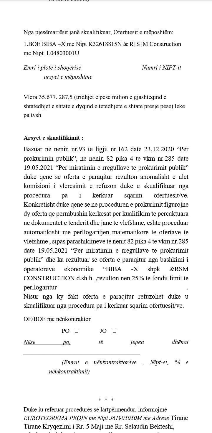 Sipas denoncimit, në këtë tender kanë marrë pjesë vetëm dy operatorë ekonomikë, ndërsa në mënyrë të papritur është skualifikuar oferta më e ulët. Në vend të saj, fituese është shpallur oferta më e lartë, me një diferencë prej rreth 120 milionë lekësh më shumë, duke ngritur dyshime serioze për favorizim dhe abuzim me fondet publike.