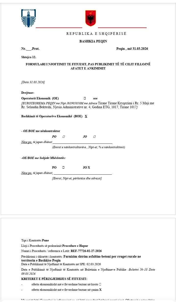 Një denoncim i mbërritur në redaksinë e Publik.al hedh dritë mbi një rast të dyshimtë në Bashkinë Peqin, lidhur me procedurën e prokurimit për “furnizim, shtrim dhe asfaltim të rrugëve”.